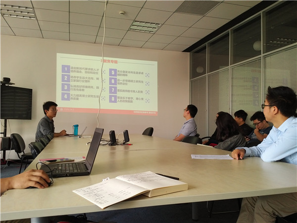 然后,會議傳達了林校長關(guān)于“教育思想大討論”交大部署動員會報告,包括交通大學40年人才培養(yǎng)回顧與認識、人才培養(yǎng)的若干問題分析等內(nèi)容。聚焦“教育思想大討論”八大專題,會議就雙一流建設、碩士生課程體系建設、博士生培養(yǎng)機制、如何培養(yǎng)學生遠大志向和家國情懷、如何實現(xiàn)由關(guān)注學校發(fā)展向關(guān)注學生發(fā)展的轉(zhuǎn)變等議題展開討論。黨支部博士生黨員代表莊子龍、劉穎超,碩士生黨員代表吳傳珣、王強、楊森、方曉猛分別根據(jù)自己在學習、科研、就業(yè)中遇到的問題,就“學在交大”積極發(fā)表意見。
