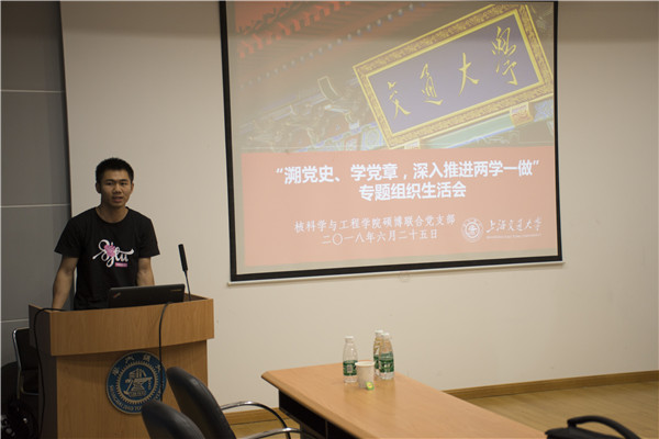 6月25日,核學(xué)院碩博聯(lián)合黨支部在機(jī)械樓F310開展了以“溯黨史、學(xué)黨章,深入推進(jìn)兩學(xué)一做”為主題的專題組織生活會(huì)。會(huì)議由碩士生黨員徐德輝主持。核學(xué)院思政老師余天佐出席了本次組織生活會(huì),碩博聯(lián)合黨支部的黨員和部分積極分子參與了本次會(huì)議的學(xué)習(xí)和討論。
