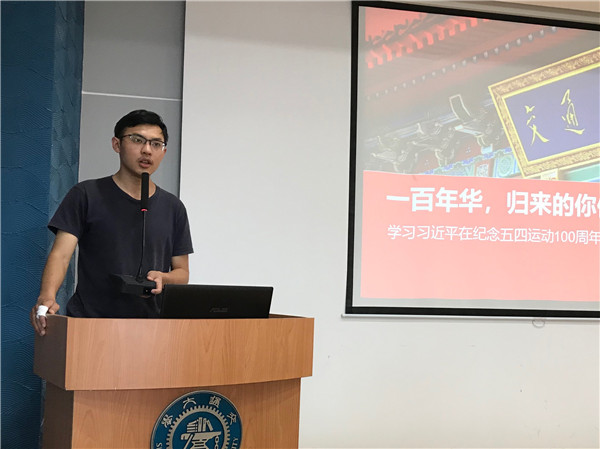 趙航以“一百年華,歸來的你依然青春”為題,帶領(lǐng)大家學(xué)習(xí)了習(xí)近平總書記在“紀念五四運動100周年大會”上發(fā)表的重要講話精神。今年是五四運動100周年,也是中華人民共和國成立70周年,五四運動具有重要的里程碑意義。習(xí)近平總書記寄語當代青年,希望廣大青年樹立遠大理想、熱愛偉大祖國、擔當時代責(zé)任、勇于砥礪奮斗、練就過硬本領(lǐng)、錘煉品德修為。隨后,大家通過短片《@總書記:中國的未來,請您放心!》,深刻感受中國新青年的風(fēng)華正茂,奮斗依舊是中國青年最鮮明的底色。