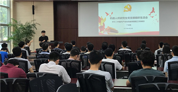 6月28日,機(jī)器人所研究生第一黨支部及第二黨支部學(xué)習(xí)《中國共產(chǎn)黨黨員教育管理工作條例》專題組織生活會(huì)在學(xué)院振華會(huì)議室舉行。支部成員、入黨積極分子及指導(dǎo)老師郭莉出席會(huì)議,會(huì)議由第二黨支部書記丁龍楊主持。
