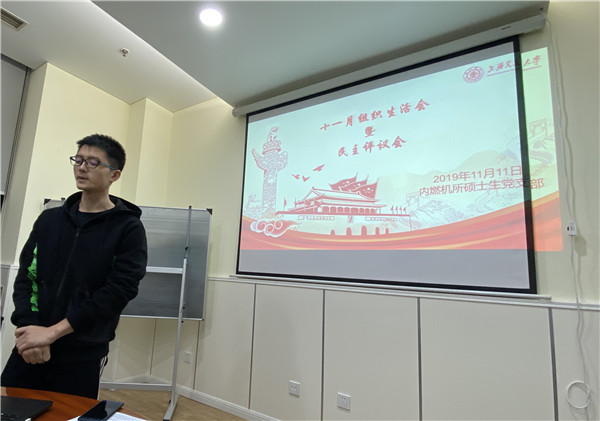 在本次會(huì)議的第一部分,劉宇森首先代表黨支部進(jìn)行了支部述職。在過去的一年中,內(nèi)燃機(jī)研究所碩士生黨支部共有39名黨員,其中有34名正式黨員(包含一名待審批黨員)和5名預(yù)備黨員。除了每個(gè)月舉辦的組織生活會(huì)外,黨支部還舉辦了其他一系列活動(dòng),例如今年3月份舉辦的畢業(yè)生遠(yuǎn)航教育求職經(jīng)驗(yàn)分享會(huì),4月份組織的“追憶歷史,珍惜和平”沙家浜風(fēng)景區(qū)參觀,10月份組織的《我和我的祖國》集體觀影等。通過舉辦上述活動(dòng),有效地加強(qiáng)了支部成員的凝聚力。