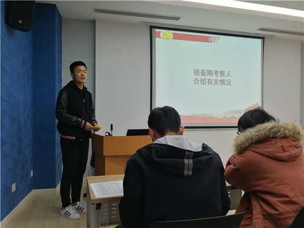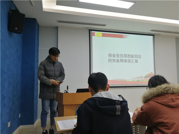 接著進(jìn)行黨員發(fā)展大會(huì),組織委員張怡潔分別介紹了鄒震峰和杜懿岑兩位同學(xué)的入黨信息、學(xué)習(xí)工作志愿等基本情況以及支部評(píng)價(jià),隨后邀請(qǐng)發(fā)展對(duì)象上臺(tái)宣讀《入黨志愿書》。在入黨介紹人介紹有關(guān)情況后,支委會(huì)綜合考慮鄒震峰和杜懿岑同學(xué)日常表現(xiàn)、考察人意見、群眾座談會(huì)意見和導(dǎo)師意見,認(rèn)為兩位同學(xué)在黨性修養(yǎng)、科研工作以及日常生活中都表現(xiàn)良好,基本符合黨員條件。與會(huì)黨員也表達(dá)了自己的意見,紛紛表示贊同支委會(huì)的考察意見。經(jīng)無記名投票表決和支部大會(huì)討論,一致同意接受鄒震峰、杜懿岑為預(yù)備黨員。兩位發(fā)展對(duì)象依次上臺(tái)進(jìn)行表態(tài)發(fā)言。