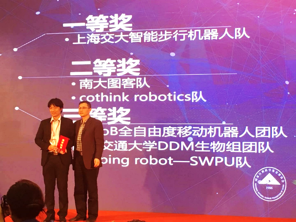 4月26-27日,由國家自然科學(xué)基金委員會(huì)主辦,中國電子學(xué)會(huì)、中國機(jī)械工程學(xué)會(huì)聯(lián)合承辦,受到國家自然科學(xué)基金委員會(huì)“共融機(jī)器人基礎(chǔ)理論與關(guān)鍵技術(shù)研究”重大研究計(jì)劃支持的首屆共融機(jī)器人挑戰(zhàn)賽在北京舉行,上海交通大學(xué)智能步行機(jī)器團(tuán)隊(duì)分別獲得了創(chuàng)新技術(shù)路演組一等獎(jiǎng)和機(jī)器人青年創(chuàng)意組二等獎(jiǎng)。