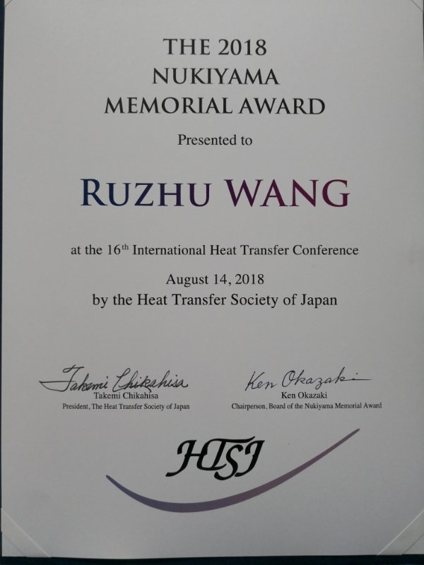 8月10日-15日,王如竹教授應(yīng)邀參加第十六屆國(guó)際傳熱大會(huì)(IHTC-16),在會(huì)上作了題為“Thermodynamic Systems for Highly Efficient Uses of Low Grade Thermal Energy”的大會(huì)全體報(bào)告,并榮獲日本傳熱學(xué)會(huì)主席以及Nukiyama獎(jiǎng)勵(lì)委員會(huì)主席正式頒發(fā)的國(guó)際熱科學(xué)紀(jì)念獎(jiǎng)Nukiyama Memorial Award。