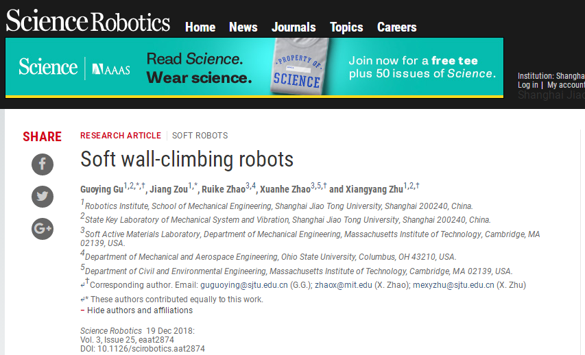 12月20日,國際著名學(xué)術(shù)期刊《科學(xué)?機(jī)器人學(xué)》(Science Robotics)在線發(fā)表了“軟體爬壁機(jī)器人”(Soft wall-climbing robots)研究論文,這是我校首次在《Science Robotics》上發(fā)表論文。該論文由機(jī)械與動力工程學(xué)院機(jī)器人研究所與麻省理工學(xué)院活性軟體材料實驗室合作完成,上海交通大學(xué)為第一單位,谷國迎教授和博士研究生鄒江為論文共同第一作者,朱向陽教授、趙選賀教授和谷國迎教授為論文的共同通訊作者。