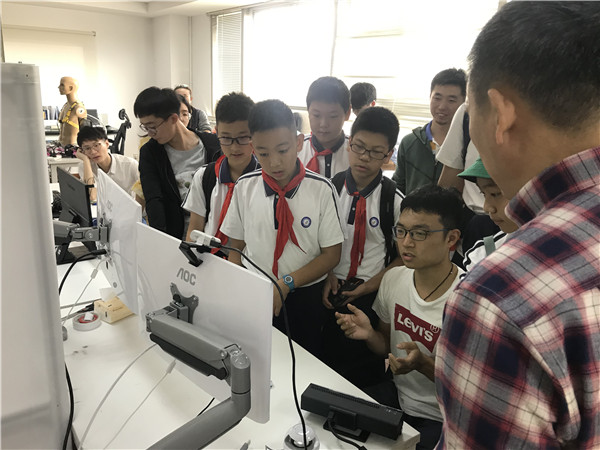在生機(jī)電一體化實(shí)驗(yàn)室,開放參觀的項(xiàng)目包含肌電信號、腦電信號的采集、解碼及應(yīng)用系統(tǒng)。志愿者王瀚介紹了肌電信號目前的一些潛在應(yīng)用以及在康復(fù)醫(yī)療中的作用,展示了系所自主研發(fā)的靈巧假肢手,通過視頻讓孩子們對于意念控制有了很好的認(rèn)識和感悟。在軟體機(jī)器人學(xué)實(shí)驗(yàn)室,志愿者劉旭講解了機(jī)器人在醫(yī)療領(lǐng)域中的應(yīng)用,展示了目前世界最先進(jìn)的腹腔鏡機(jī)器人,它將開啟未來微創(chuàng)手術(shù)機(jī)器人的研究方向,并在提升醫(yī)療技術(shù)方面起到重要作用。參觀過程中不斷有孩子們舉手提問,表達(dá)他們對于科學(xué)世界的好奇與憧憬,志愿者們都一一給予細(xì)致地解答。