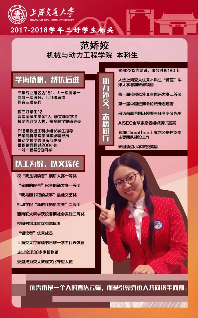 12月5日,2017-2018學(xué)年上海交通大學(xué)“三好學(xué)生標(biāo)兵”答辯評審會舉行。機(jī)械與動力工程學(xué)院范嬌姣同學(xué)憑借出色的表現(xiàn),獲得了“三好學(xué)生標(biāo)兵”稱號。