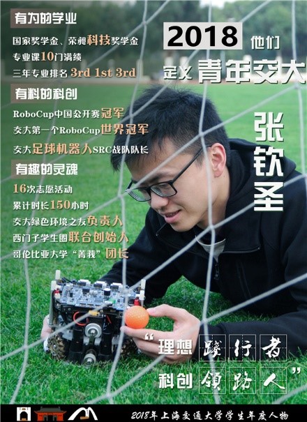 張欽圣創(chuàng)建并擔(dān)任交大RoboCup小型組隊(duì)伍SRC隊(duì)長(zhǎng),帶領(lǐng)團(tuán)隊(duì)在2017年名古屋世界杯中斬獲交大歷史上第一個(gè)RoboCup世界冠軍,隨后又帶領(lǐng)團(tuán)隊(duì)獲得RoboCup2018年中國(guó)公開賽冠軍。他投身智能機(jī)器人領(lǐng)域,參與了仙知機(jī)器人AGV無人車開發(fā),成功在2018中國(guó)國(guó)際工業(yè)博覽會(huì)展出。張欽圣還曾以專業(yè)前三的優(yōu)異成績(jī),獲國(guó)家獎(jiǎng)學(xué)金、榮昶科技獎(jiǎng)學(xué)金等榮譽(yù)。
