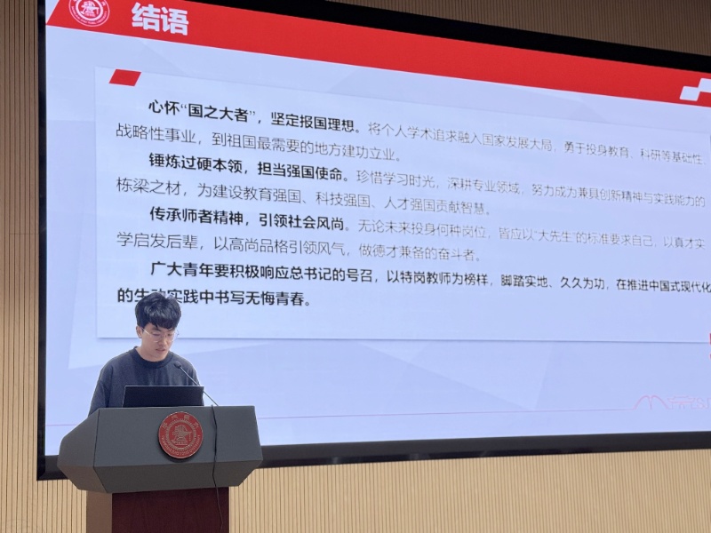 機器人所研究生第一團支部書記張若珩以“學習偉大抗戰(zhàn)精神”為主題,結(jié)合抗戰(zhàn)勝利80周年重要背景,系統(tǒng)闡述了抗戰(zhàn)精神的核心內(nèi)涵,引導團員將愛國情懷與民族氣節(jié)融入科研創(chuàng)新與個人成長。第三團支部書記周成元帶領(lǐng)學習習近平總書記給特崗教師的重要回信精神,鼓勵團員立足專業(yè)、服務(wù)國家需要。第二團支部書記茍栩?qū)庨_展國家安全專題教育,強化團員法治意識和風險防范能力。機電所研究生團支部書記宋旭陽圍繞樹立正確就業(yè)觀進行分享,倡導青年在祖國最需要的地方實現(xiàn)價值。