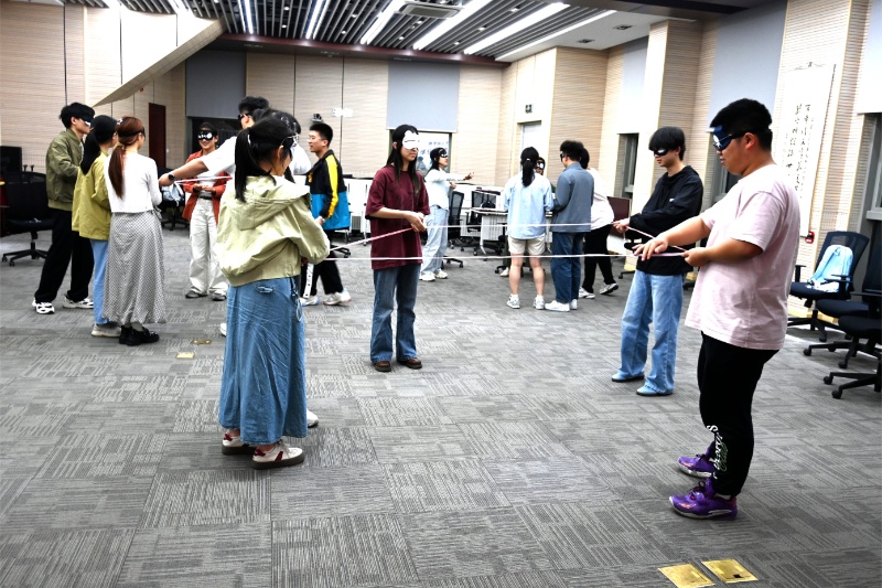 隨后的“盲人方陣”協(xié)作挑戰(zhàn)中,林曉桐通過蒙眼組繩的沉浸式體驗(yàn),讓同學(xué)們?cè)诤诎抵泄矄⑿湃沃谩!跋蜃笕健薄氨3掷K子張力”的指令交織中,各小組最終呈現(xiàn)的幾何圖案不僅展現(xiàn)團(tuán)隊(duì)默契,更引發(fā)對(duì)溝通藝術(shù)的深層思考,胡文婷也從專業(yè)角度點(diǎn)評(píng)了活動(dòng)的亮點(diǎn)和提升空間。