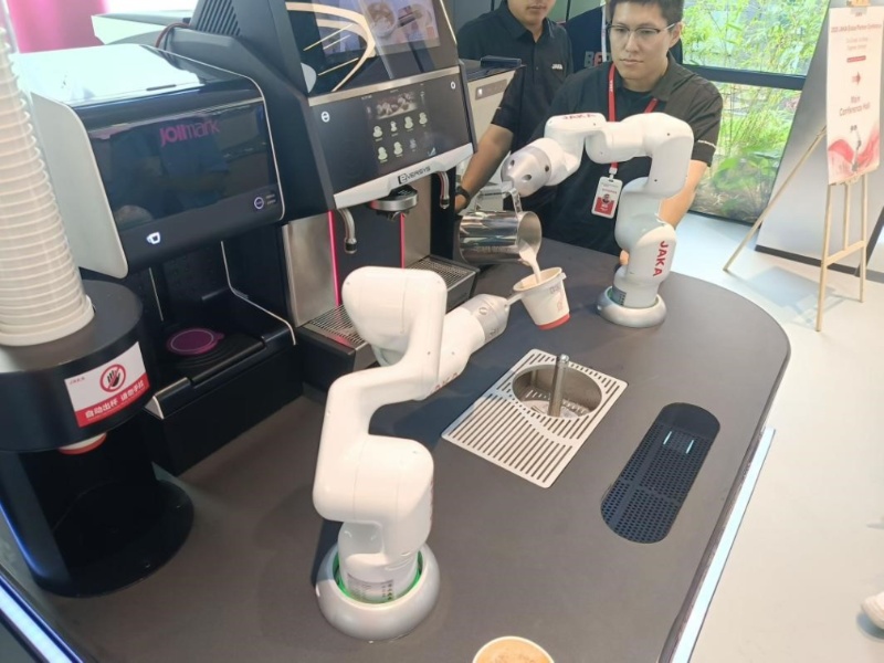師生一行在企業(yè)講解人員的帶領(lǐng)下,參觀了節(jié)卡機(jī)器人的產(chǎn)品展示區(qū),深入了解公司在協(xié)作機(jī)器人領(lǐng)域的創(chuàng)新設(shè)計(jì)理念與核心技術(shù)。企業(yè)展示了其機(jī)器人產(chǎn)品在汽車制造、電子器件、智能產(chǎn)線等高端制造領(lǐng)域的廣泛應(yīng)用,充分展現(xiàn)出中國(guó)在推動(dòng)新質(zhì)生產(chǎn)力方面的科技實(shí)力與產(chǎn)業(yè)布局。更令同學(xué)們驚喜的是,節(jié)卡公司還將機(jī)器人技術(shù)延伸至日常生活場(chǎng)景,開發(fā)了自動(dòng)咖啡沖泡系統(tǒng)與機(jī)器人面條機(jī)等產(chǎn)品。現(xiàn)場(chǎng)演示生動(dòng)有趣,既展現(xiàn)出人工智能在生活服務(wù)領(lǐng)域的創(chuàng)新融合,也彰顯出中國(guó)式現(xiàn)代化所蘊(yùn)含的智慧生活理念。