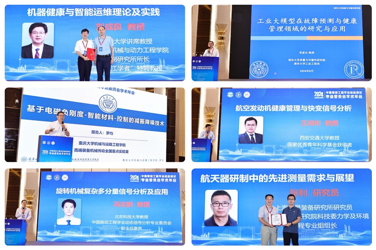 報告交流環(huán)節(jié)包括14個主會場學術(shù)報告和60個分會場學術(shù)報告。上海交通大學劉成良教授作《機器健康與智能運維理論及實踐》、清華大學李彥夫教授作《工業(yè)大模型在 PHM 領域的研究與應用》、重慶大學羅均教授作《基于電磁負剛度-智能材料-控制的減振降噪技術(shù)》、西安交通大學王詩彬教授作《航空發(fā)動機健康管理與快變信號分析》、北京科技大學馮志鵬教授作《旋轉(zhuǎn)機械復雜多分量信號分析及應用》、上海衛(wèi)星裝備研究所張利研究員作《航天器研制中的先進測量需求與展望》、華中科技大學博士生曹子榆作《光電計算芯片與人工智能應用》、上海交通大學熊玉勇副教授作《基于微波感知的全場振動及形變測量技術(shù)與儀器》、南昌航空大學李志農(nóng)教授作《面向聯(lián)邦學習故障診斷模型的思考》、西安交通大學曹軍義教授作《自供能傳感設計與健康監(jiān)測方法》、重慶大學湯寶平教授作《大型旋轉(zhuǎn)機組健康管理系統(tǒng)軟件與圖形化編程云平臺》、深圳大學曹廣忠教授作《磁懸浮技術(shù)在半導體裝備中的應用》、華中科技大學何嶺松教授作《Python 在測試技術(shù)實踐教學中的應用和軟件工具開發(fā)》、西安交通大學張小棟教授作《機械工程測試技術(shù)一流課程建設與思考》大會主題報告。報告內(nèi)容反映了相關(guān)學科領域的前沿科研和教學的未來發(fā)展方向,引起了與會代表老師的熱烈反響和積極討論。