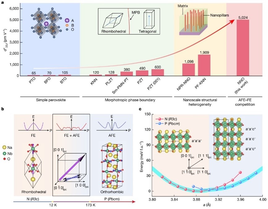 9月11日,機械與動力工程學院前瞻交叉研究中心楊天南副教授在Nature上發(fā)表題為“Ultrahigh electromechanical response from competing ferroic orders”的研究論文,提出了基于極化序構競爭的機電耦合材料設計策略,通過構建反鐵電與鐵電相共存,增強電場誘導的晶格序構響應,實現(xiàn)材料壓電性顯著提高。楊天南副教授為共同第一作者,另兩位共同第一作者為新加坡科技研究局/新加坡南洋理工大學博士生林柏臣、新加坡科技研究局Khuong Phuong Ong研究員,通訊作者為新加坡南洋理工大學Yeng Ming Lam教授與新加坡科技研究局劉華俊研究員。