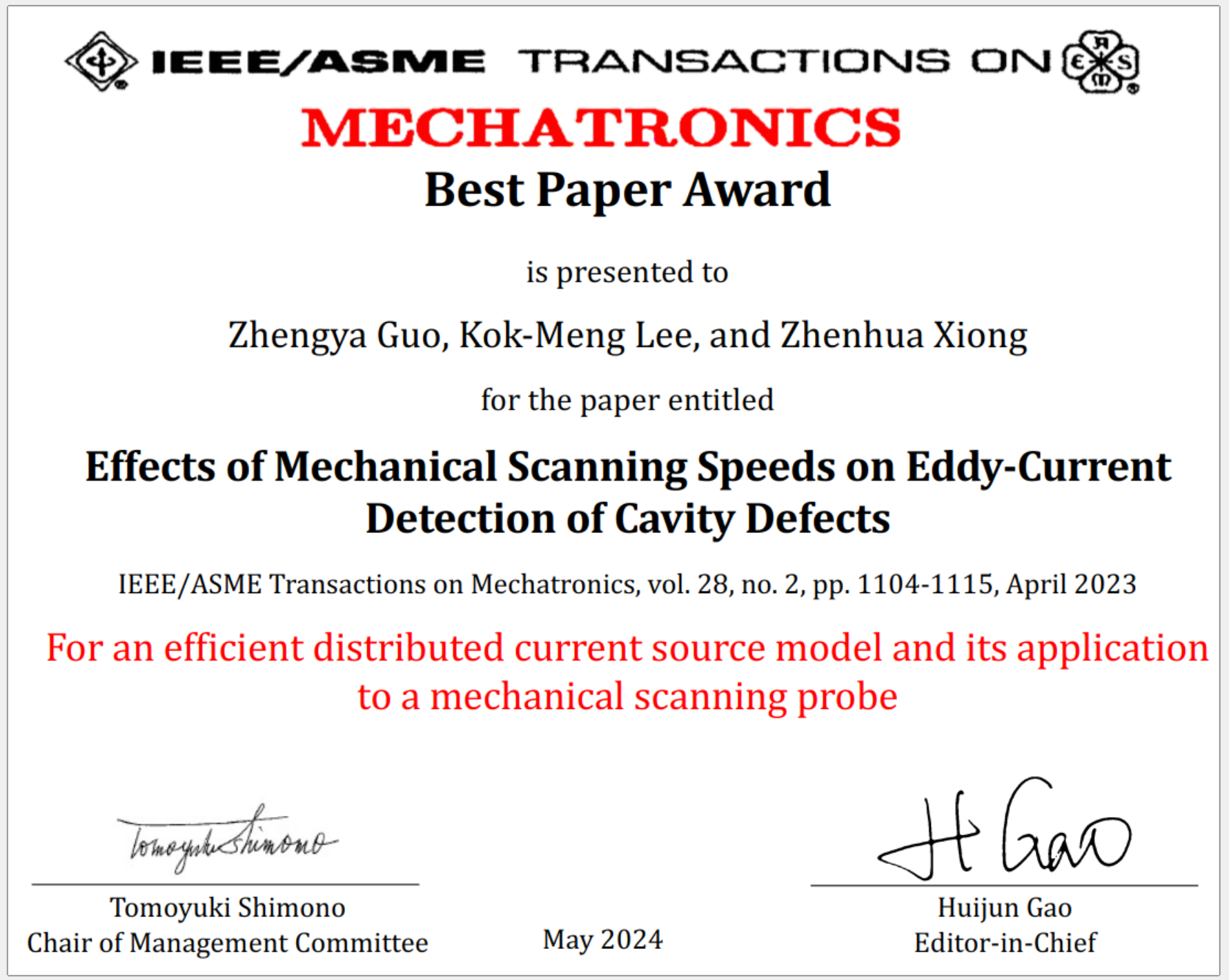 近日,2024年IEEE先進(jìn)智能機(jī)電一體化國際會(huì)議(IEEE/ASME International Conference on Advanced Intelligent Mechatronics)召開,會(huì)上頒發(fā)2023年IEEE/ASME Transactions on Mechatronics最佳論文獎(jiǎng),機(jī)器人研究所熊振華教授團(tuán)隊(duì)與美國佐治亞理工學(xué)院Kok-Meng Lee教授合作完成的“Effects of Mechanical Scanning Speeds on Eddy-Current Detection of Cavity Defects”論文獲此榮譽(yù)。論文第一作者為博士研究生郭政亞,熊振華教授和Kok-Meng Lee教授為共同通訊作者。