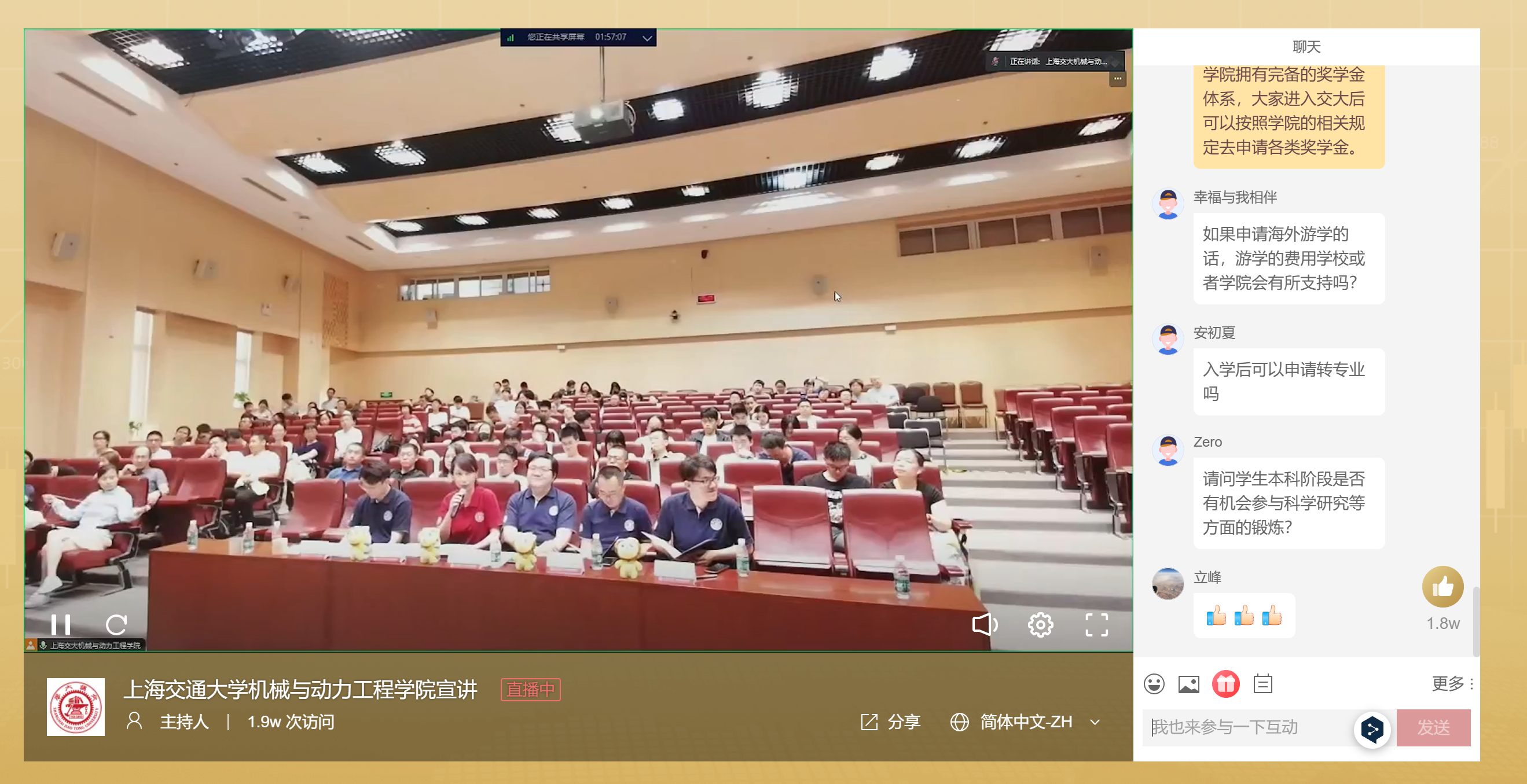 6月16日,上海交通大學(xué)“校園開放日”機(jī)械與動(dòng)力工程學(xué)院專場(chǎng)活動(dòng)順利舉行。本次活動(dòng)采用線上線下相結(jié)合的形式,來自全國(guó)各地的考生及家長(zhǎng)通過聆聽宣講、問詢交流、觀覽視頻、參觀實(shí)驗(yàn)室等,深入了解了學(xué)院專業(yè)建設(shè)、人才培養(yǎng)模式、畢業(yè)發(fā)展方向等,2萬(wàn)余名學(xué)生及家長(zhǎng)參加了活動(dòng)。
