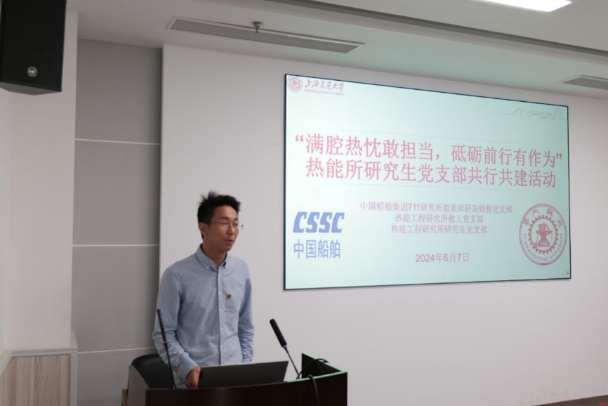 6月7日,熱能工程研究所教工黨支部、研究生黨支部聯(lián)合七一一所能裝部研發(fā)銷售黨支部開展了“滿腔熱忱敢擔(dān)當(dāng),砥礪前行有作為”的共行共建活動。七一一所能裝部研發(fā)銷售黨支部、低溫?zé)狳h支部黨員以及熱能工程研究所師生黨員參加了活動。