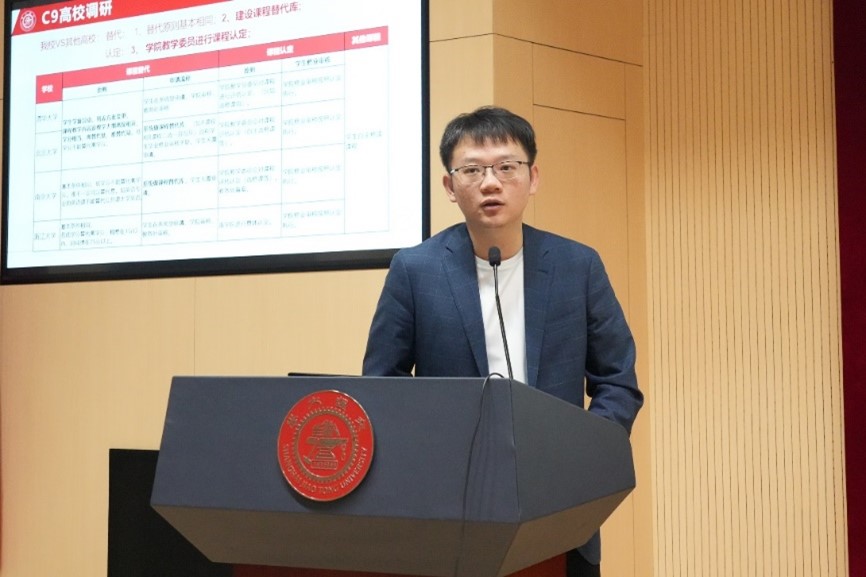 校教務(wù)處副處長王鴻東匯報(bào)了自主轉(zhuǎn)專業(yè)新政策下的課程替代方案調(diào)研情況,以及實(shí)施路徑,表示將組織校院協(xié)同溝通會與論證會,聯(lián)合建設(shè)課程替代查詢庫,全面保障學(xué)生修業(yè)及培養(yǎng)。