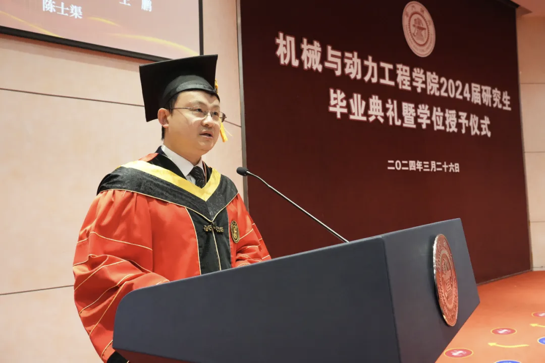 3月26日,機(jī)械與動力工程學(xué)院舉行2024屆研究生畢業(yè)典禮暨學(xué)位授予儀式。學(xué)院院長杜朝輝,黨委書記胡永祥,副院長李玉陽、夏唐斌,導(dǎo)師代表劉成良、曹其新、歐陽華,研究生班主任張希、潘爾順、熊進(jìn)標(biāo),上海伯鐳智能科技有限公司聯(lián)合創(chuàng)始人兼CTO、2007屆本科、2014屆博士校友楊揚(yáng),以及2024屆研究生(含MEM研究生)畢業(yè)生等參加了典禮。典禮由學(xué)院黨委副書記張執(zhí)南主持。