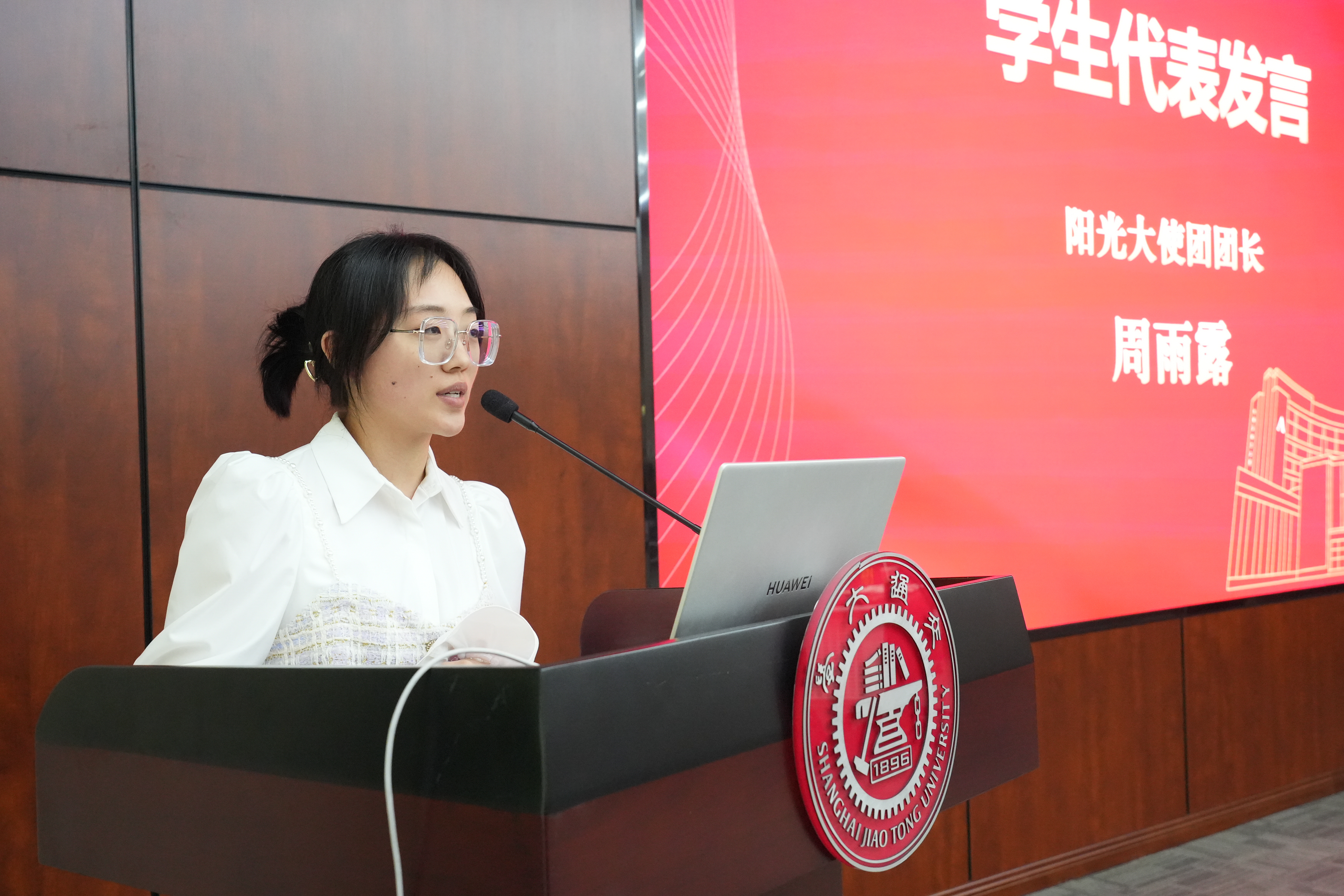 周雨露作為陽光大使團學生代表發(fā)言,表示將充分依托心理輔導(dǎo)站平臺,更加專業(yè)、廣泛地傾聽學生們的心聲,進一步發(fā)揮朋輩互助的力量。