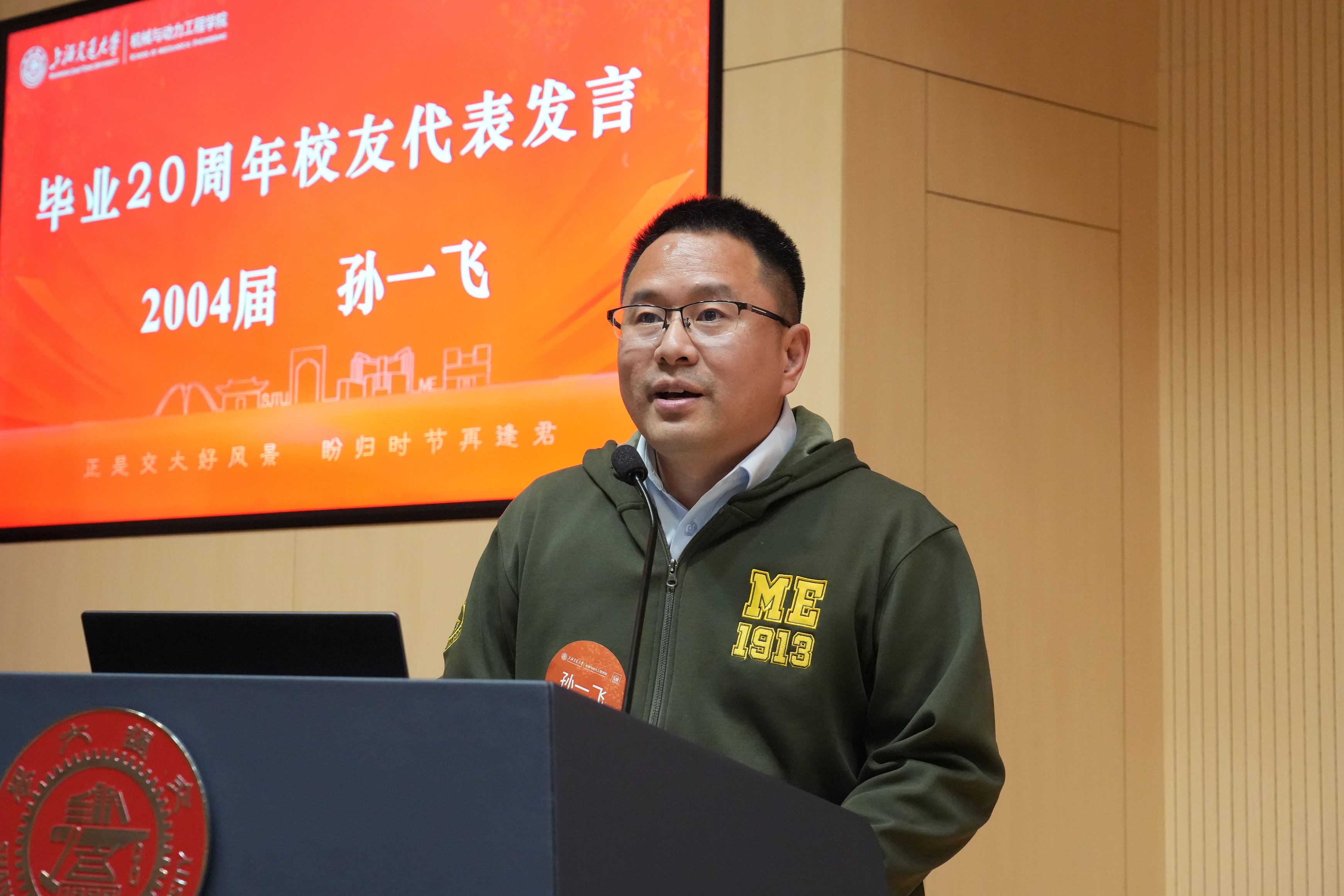 2004屆校友孫一飛作為畢業(yè)20周年校友代表,表示2004屆畢業(yè)生中涌現(xiàn)出一批為國家重大裝備研發(fā)、行業(yè)發(fā)展以及學(xué)術(shù)探索等做出積極貢獻(xiàn)的校友,呼吁校友們把自己20年的行業(yè)積累和學(xué)院的發(fā)展結(jié)合起來,為學(xué)院人才培養(yǎng)、科學(xué)研究貢獻(xiàn)力量。