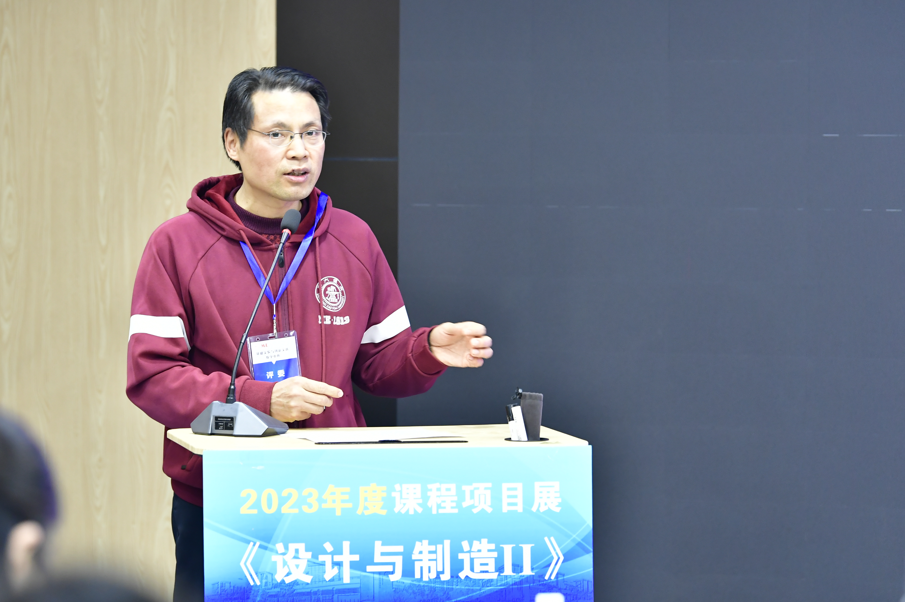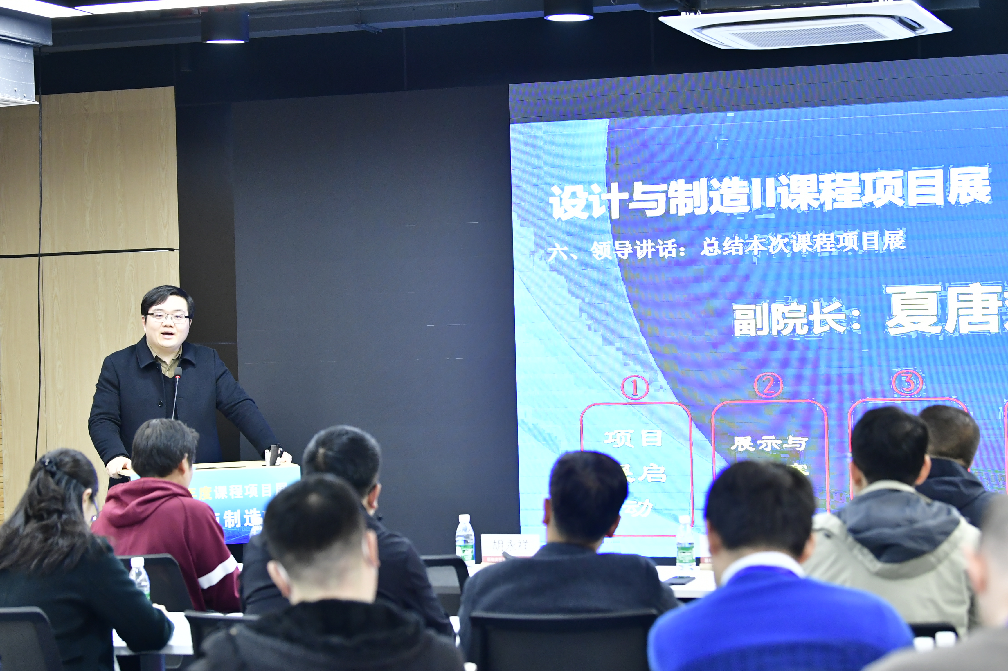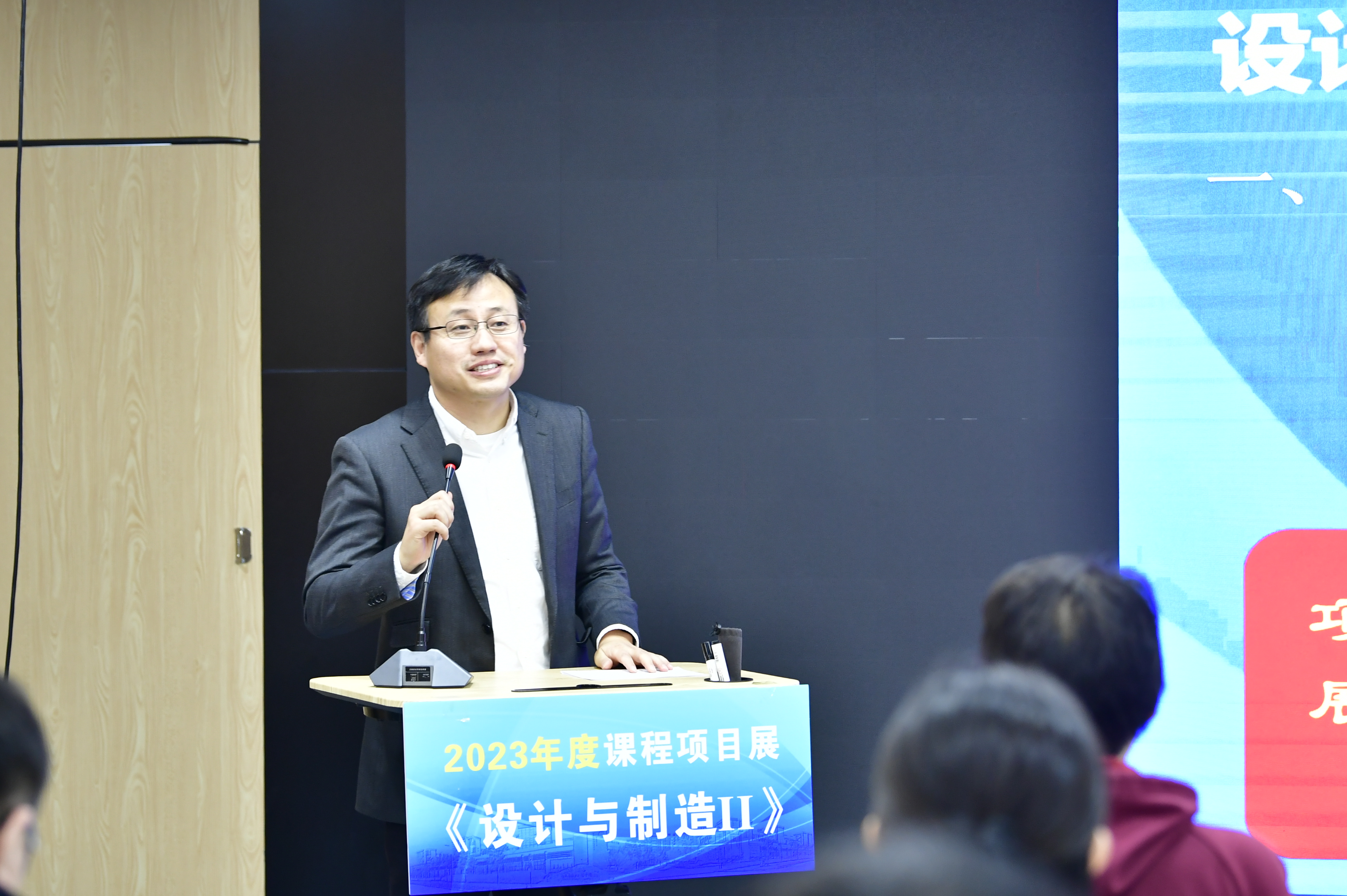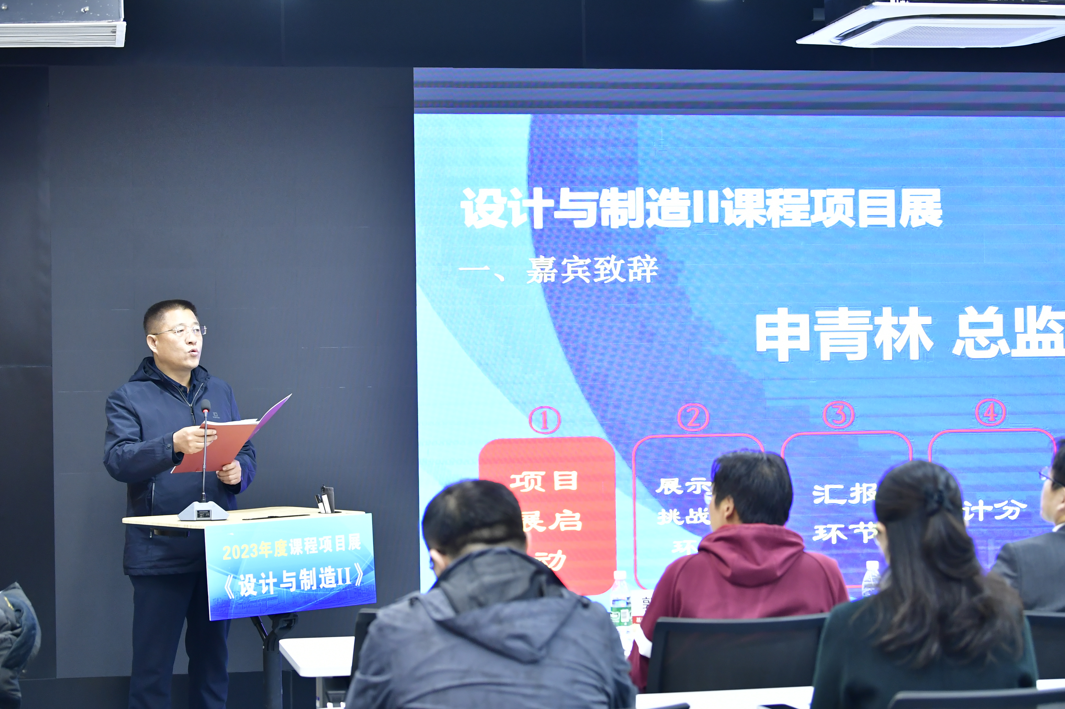 課程負責(zé)人郭為忠作課程和項目展情況介紹。《設(shè)計與制造II》采用課堂教學(xué)和課外項目制作雙主線教學(xué)方法,將課上知識和課下作品制作相結(jié)合,使學(xué)生經(jīng)歷小型機器的完整開發(fā)過程。同時,本年度項目選題來源于自主命題、挑戰(zhàn)賽和企業(yè)難題三個方向,學(xué)生們根據(jù)興趣自主選題參展。