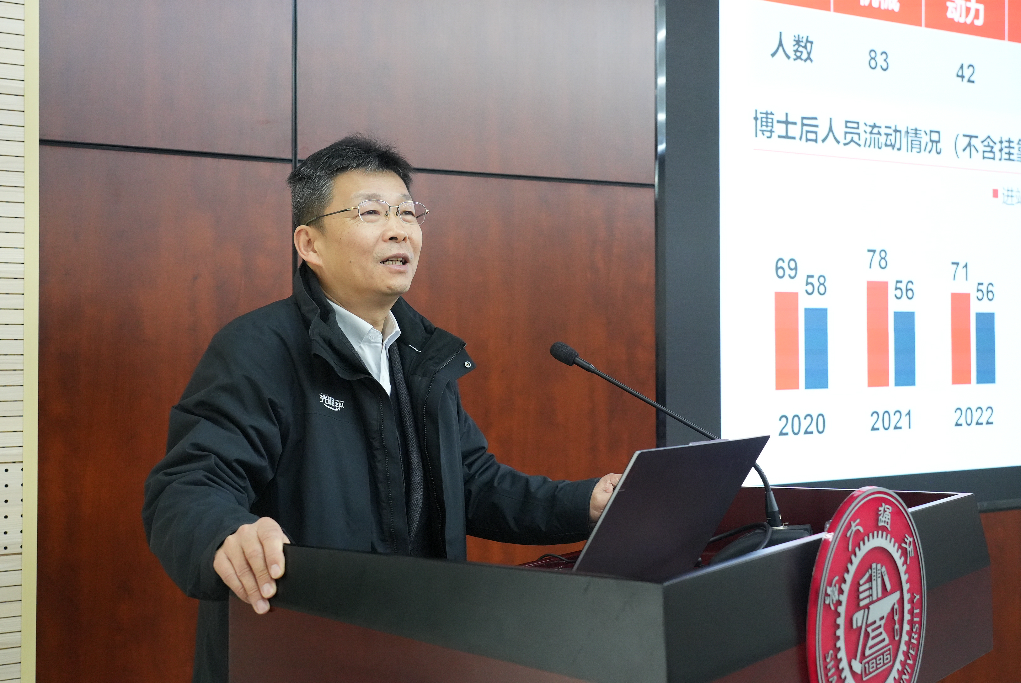 院長(zhǎng)杜朝輝介紹了目前學(xué)院博士后隊(duì)伍總體發(fā)展情況,梳理了近年來博士后各類基金、項(xiàng)目、計(jì)劃的獲資助情況,明確了學(xué)院對(duì)博士后的在站工作要求,并就博士后工作期限、因公出國(guó)(境)管理規(guī)定、年度考核等內(nèi)容做了重點(diǎn)介紹,希望大家重視和把握基金、項(xiàng)目等的申請(qǐng)機(jī)會(huì),積極參與科研訓(xùn)練和集體活動(dòng)。