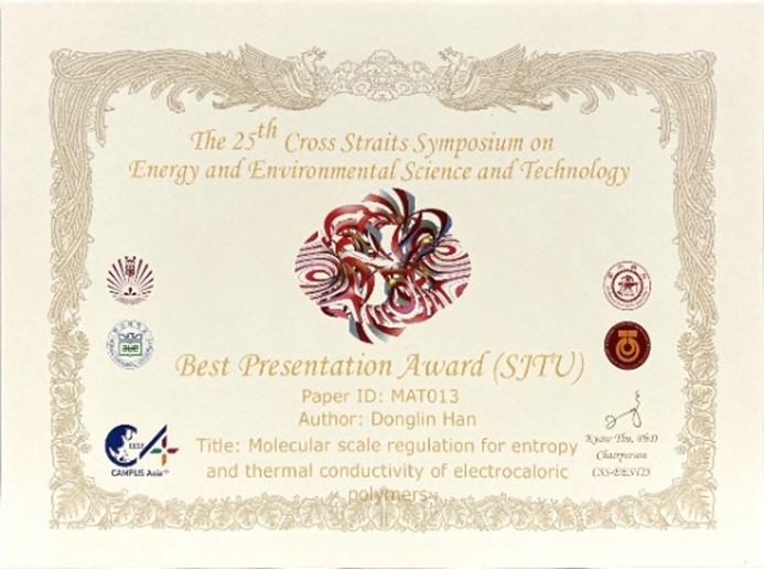 11月19-22日,第25屆“亞洲校園”CSS國(guó)際學(xué)術(shù)會(huì)議在日本福岡舉辦。本屆國(guó)際學(xué)術(shù)報(bào)告會(huì)由日本九州大學(xué)主辦,上海交通大學(xué)與韓國(guó)釜山國(guó)立大學(xué)、馬來(lái)西亞理工大學(xué)聯(lián)合舉辦,來(lái)自四所亞洲高校能源、環(huán)境、材料、化工領(lǐng)域的30多位教授和80余名研究生參加,我院4名優(yōu)秀博士生入選參加活動(dòng)并分別進(jìn)行了口頭匯報(bào)。在會(huì)議閉幕式上,我院博士生韓東霖論文Molecular scale regulationn for entropy and thermal conductivity of electrocaloric polymers獲最佳論文獎(jiǎng),論文也獲得推薦,將發(fā)表于EVERGREEN(Joint Journal of Novel Carbon Resource Sciences & Green Asia Strategy)期刊。