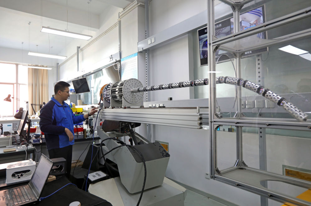 上海交大機械與動力工程學院的學生在操作展示面向復雜狹窄結構探測清除的繩驅動超冗余度機器人(11月24日攝)