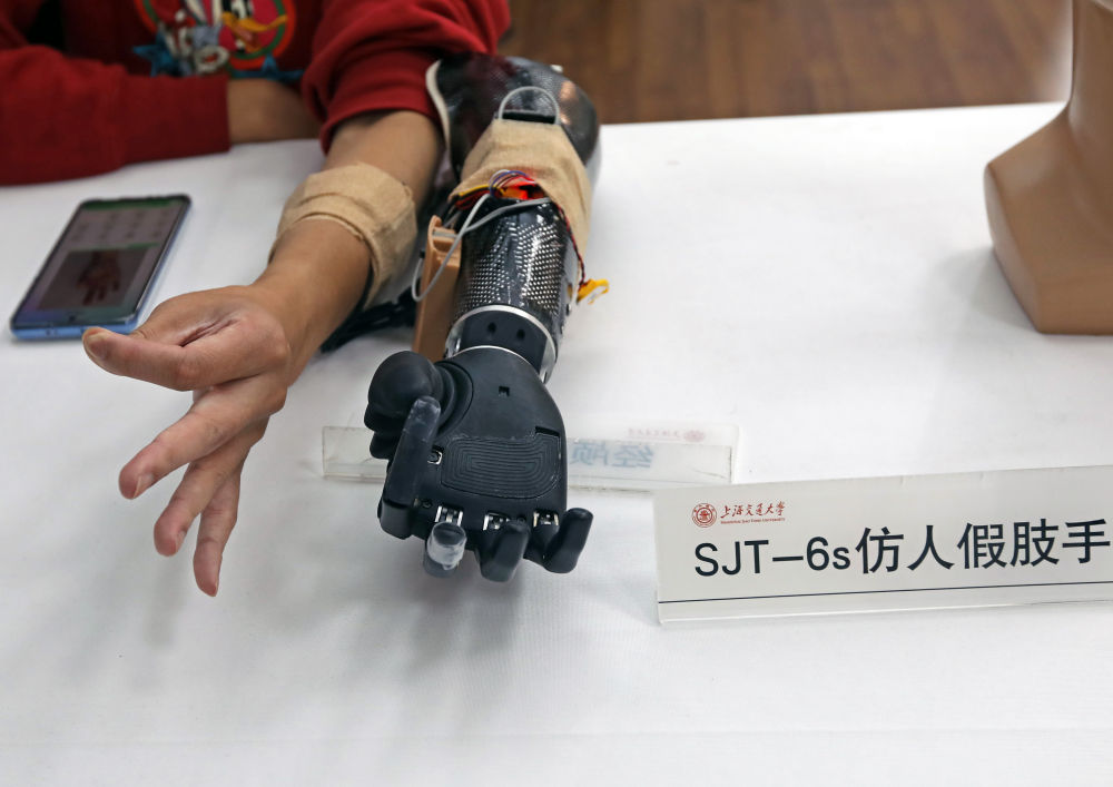 在上海交大機器人研究所的生機電實驗室,學生在展示智能假肢(11月24日攝)