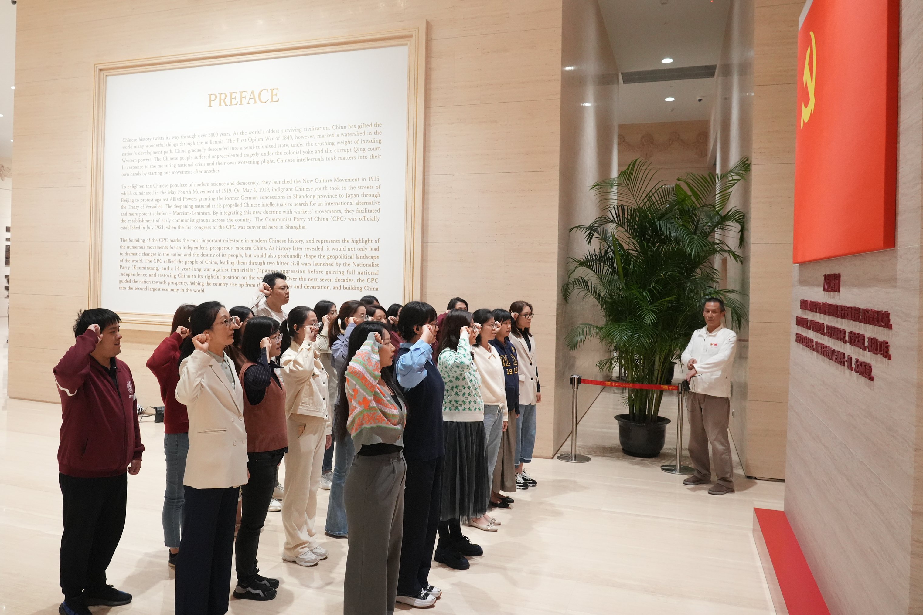 上海是黨的誕生地,是中國共產(chǎn)黨人的初心始發(fā)地。黨員們?cè)谥泄惨淮髸?huì)址,瞻仰學(xué)習(xí)了中國共產(chǎn)黨創(chuàng)建的歷史邏輯、理論邏輯和實(shí)踐邏輯,通過文物、圖片、影片等了解了中國共產(chǎn)黨帶領(lǐng)中國人民建立新中國、建設(shè)社會(huì)主義的偉大歷程,并集體面向黨旗重溫入黨誓詞,堅(jiān)定理想信念。大家還來到老漁陽里2號(hào)《新青年》編輯部舊址,實(shí)地學(xué)習(xí)了《新青年》雜志的辦刊歷程,以及早期共產(chǎn)黨人以無畏的勇氣探索救亡圖存道路的故事。