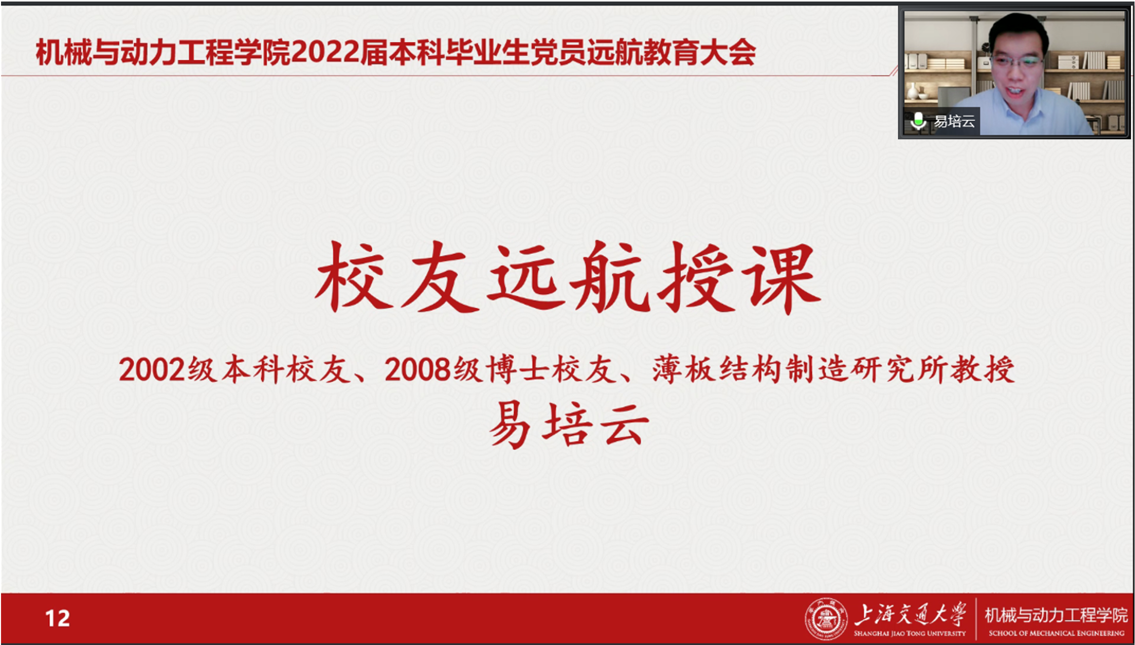 6月18日,機(jī)械與動力工程學(xué)院“思源致遠(yuǎn),揚(yáng)帆遠(yuǎn)航”2022屆本科生畢業(yè)生黨員遠(yuǎn)航教育大會線上舉行。機(jī)械與動力工程學(xué)院黨委書記林立濤,黨委副書記張執(zhí)南,2002級本科校友、2008級博士校友、薄板結(jié)構(gòu)制造研究所教授易培云,思政教師、輔導(dǎo)員以及2022屆本科生畢業(yè)生黨員參加了大會。大會由學(xué)院本科生黨建工作負(fù)責(zé)人蘇友煌主持。