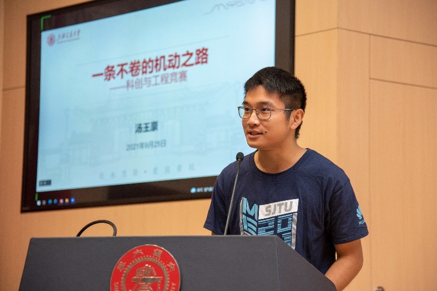 高峰教授圍繞現(xiàn)代機(jī)器人的行為智能主題,帶領(lǐng)同學(xué)們了解步行機(jī)器人領(lǐng)域的前沿研究成果,鼓勵(lì)大家主動(dòng)培養(yǎng)科研品質(zhì)與探索精神。湯王豪同學(xué)以“科創(chuàng)與工程:一條不卷的機(jī)動(dòng)之路”為題,結(jié)合賽車工程競賽經(jīng)歷,介紹了學(xué)習(xí)之余以科創(chuàng)賽事與工程實(shí)踐為主的本科生活。