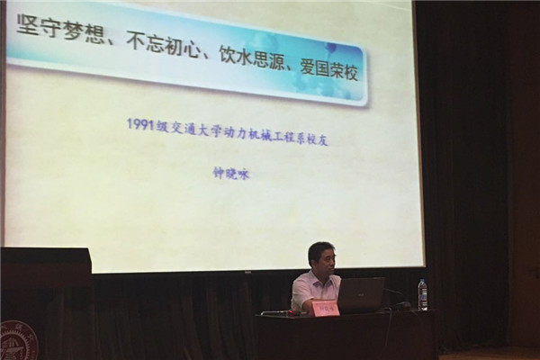 鐘曉詠以“堅守夢想,不忘初心,飲水思源,愛國榮校”為主題與同學(xué)們分享成長與感悟。1991年考入上海交通大學(xué)動力機械工程系,四年交大時光,他至今記憶深刻。本科畢業(yè)時,在人生選擇的十字路口,他堅信理想與信仰,義無反顧地投身公安事業(yè)。在公安系統(tǒng)的考試中,鐘曉詠以“我有一個夢想”為主題講述自己的人生理想。他說:“人要有夢想,有夢想的人才會有志向;作為一名交大人,夢想要有更高的價值追求,那就是志向和情懷。”在政法系統(tǒng)二十余年的工作中,鐘曉詠不忘初心,始終履行一名交大人、一名共產(chǎn)黨員的責(zé)任。他還談到了交大120周年校慶典禮上的黃旭華學(xué)長,談到自己參觀錢學(xué)森圖書館時的所感,表達(dá)了自己深深的敬佩之情。他強調(diào),有夢想易,能堅守難,堅守就是不忘初心,要經(jīng)得住功名利祿的考驗、經(jīng)得住時間流逝的考驗、經(jīng)得住認(rèn)知水平差異和局限的考驗。談到責(zé)任與擔(dān)當(dāng),鐘曉詠從交大人建造的南海鉆井平臺,講到自己在工作中為國家安全所付出的努力,從交大“飲水思源,愛國榮校”的校訓(xùn),談到交大人應(yīng)當(dāng)為每一次國家和社會進(jìn)步中的奉獻(xiàn)而自豪,在每一個崗位和每一份工作中,心存國家和民族歷史使命感。